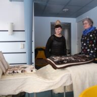 Kuvassa Sirpa Jämsä on kietoutuneena esiteltyyn avaruuspeittoon, mikä saattaa olla hyvä lämmön lähde tarvittaessa.